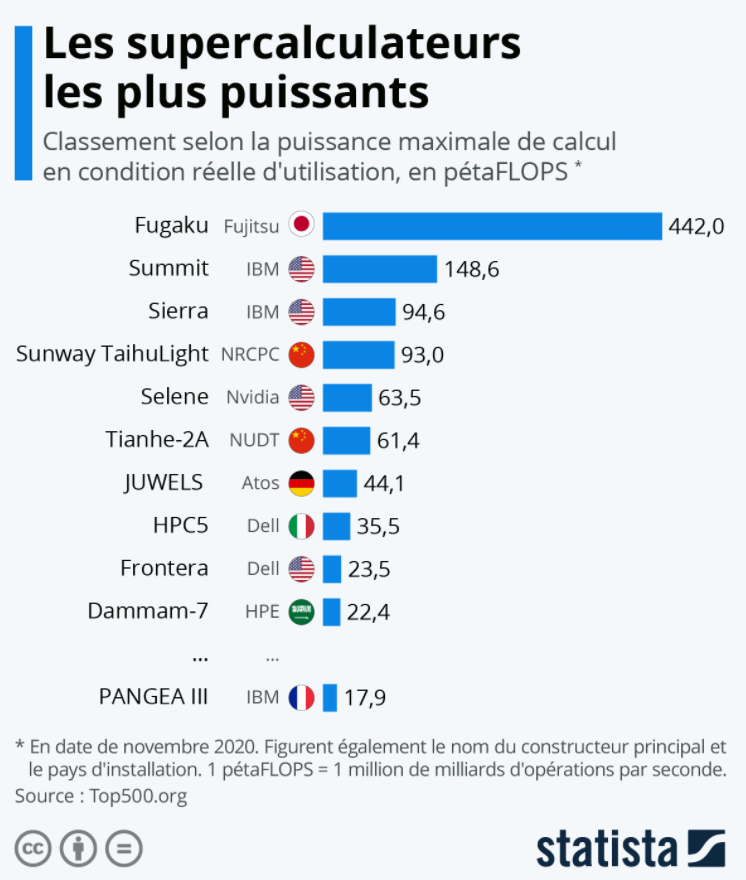 Le supercalculateur Fugaku, développé par Fujitsu en coopération avec l'institut de recherche japonais Riken, écrase toujours la concurrence avec une puissance de calcul de 442 pétaflops*, soit l'équivalent de 442 millions de milliards d'opérations par seconde. Il est capable d'effectuer près de trois fois plus d'opérations par seconde que le second de cette liste, le supercalculateur américain Summit, et dix fois plus que le leader européen Juwels.
