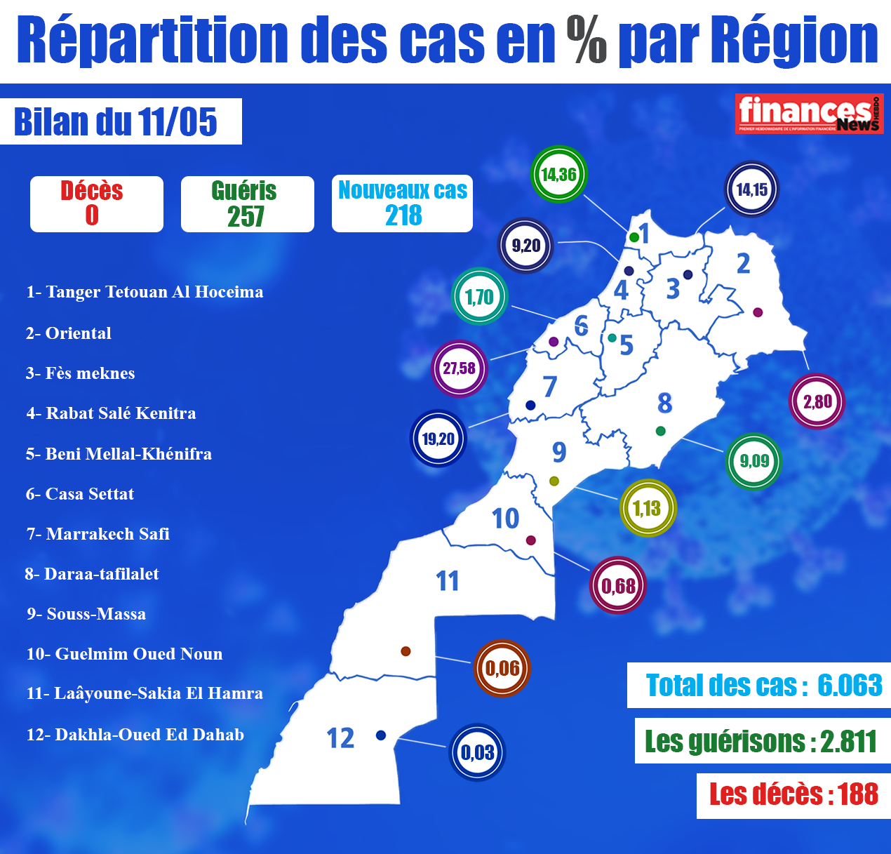 Bilan Coronavirus au Maroc du 11 mai : 218 contaminations, 257 guérisons et 0 décès. Voici les détails :
